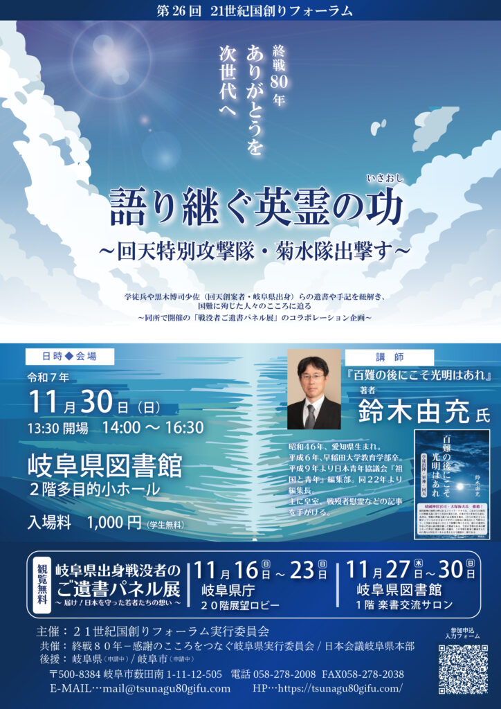 - 21世紀国創りフォーラム開催案内11月30日、第26回21世紀国創りフォーラムを開催します。 21世紀国創りフォーラム・終戦80年感謝のこころ… 続きを読む: 21世紀国創りフォーラム開催案内