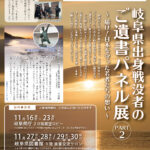 - 県庁・県図書館でのパネル展示案内終戦から80年の節目にあたり、8月に岐阜市メディアコスモスおよび岐阜市役所で開催した戦没者のご遺書パネル展は大… 続きを読む: 県庁・県図書館でのパネル展示案内
