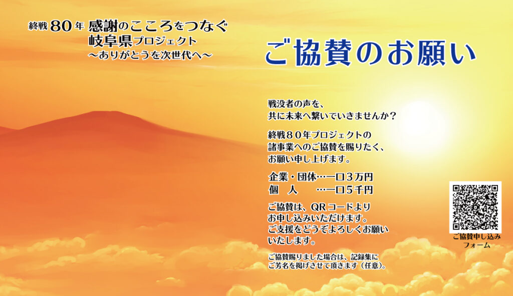 私たちは、先の大戦で戦没された方々への感謝のこころをつなぎ、この想いを次世代につなぐべく、「終戦80年~感謝の心を繋ぐ岐阜県プロジェクト」を立ち上げました。